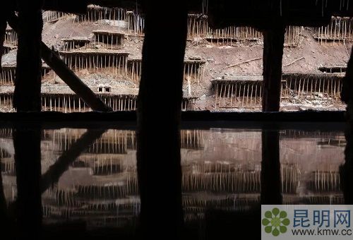 瀾滄江岸邊,鹽民們高高低低開(kāi)出了無(wú)數(shù)道斜坡,密密麻麻的原木柱子支撐著方塊狀的鹽田。