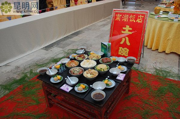 涼拌雞、扣雞、扣肉、蹄花青筍、生爆油炸肉、扣蛋卷、粉蒸肉、三絲炒面,每一個大海碗里,除了上面蓋滿的肉類之外,下面還藏了各種蔬菜,八個葷菜下面就是八個蔬菜,可謂是葷素搭配合理的健康菜。這些普通的菜肴做成功夫菜肴之后,就成為耙、爛、淡、燙的紅河名菜。這種菜特別適合老人群體享用,故也可以稱為敬老菜。