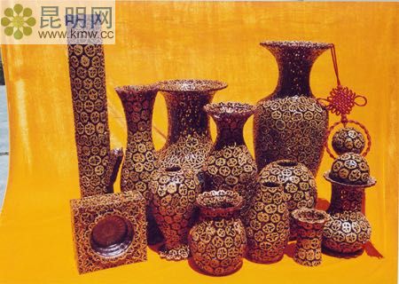 采用漾濞野生鐵核桃果果皮(殼)為原料,經多道工序全手工制作,完整的保留了核桃的原紿外形和花紋,具有天然的美感。主要有花瓶、臺燈、煙灰缸、紙巾盒、筆筒等大類。