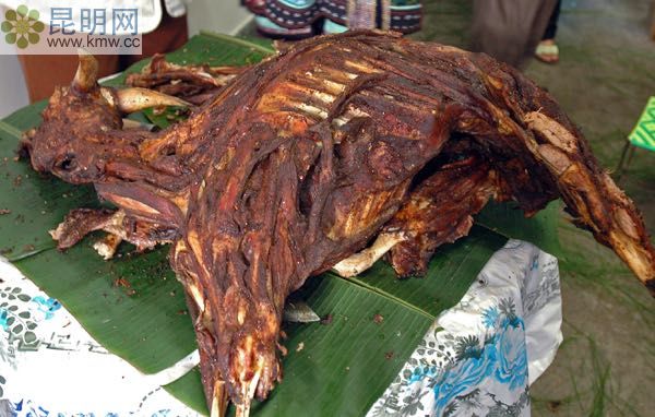 漾濞名菜,采用當地黑山羊及各種香料,用外烤內蒸的方法烹制,肉質鮮嫩,原汁原味,不燥熱。