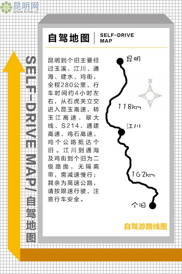 6、 雞街——個舊市(雞個公路)公路里程:約22公里 行車時間:半小時 除江川到通海及雞街到個舊為二級路外,全程高速公路,請按限速行駛,注意行車安全。