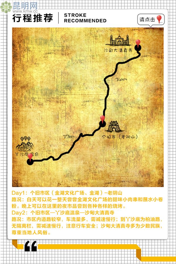 個舊市—丫沙底溫泉(37公里,1小時)—沙甸大清真寺(61公里,1.5小時)