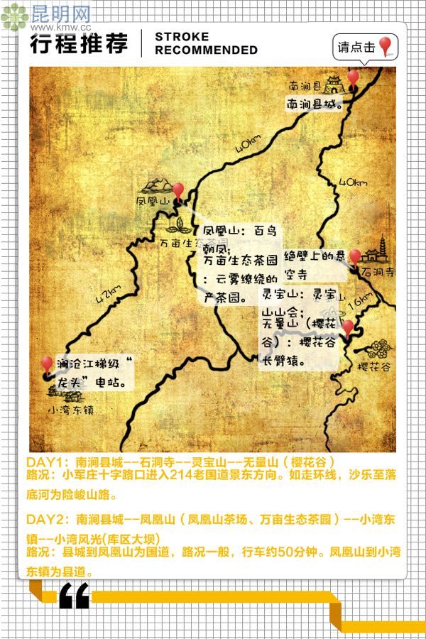 南澗縣城-40km-鳳凰山(鳳凰山茶場、萬畝生態茶園)-42km-小灣東鎮-10km小灣風光(庫區大壩)