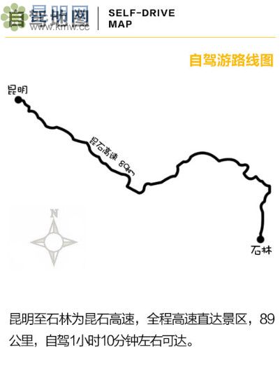 昆明至石林為昆石高速,全程高速直達景區(qū),89公里,自駕1小時10分鐘左右可達。
