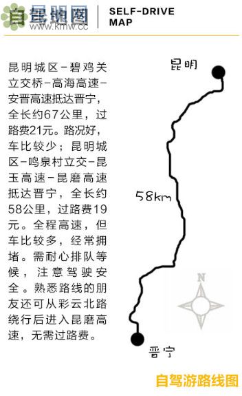昆明城區-碧雞關立交橋-高海高速-安晉高速抵達晉寧,全長約67公里,過路費21元。路況好,車比較少;