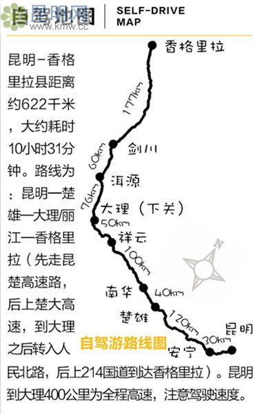 昆明至香格里拉縣距離622千米,大約耗時10小時30分。路線為昆明-楚雄-大理/麗江-香格里拉(先走昆楚高速,后上楚大高速,到大理后轉入人民北路,后上214國道到達香格里拉)。昆明到大理400千米,全程高速,注意行車安全。
