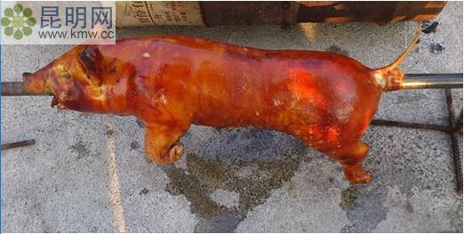 烤豬以小豬為主要原料,宰殺后,去其肚雜,刮凈豬毛,涂上香料、香油,以通桿由豬股部刺入,由眼部穿出,置于燒旺的炭火上烘烤,直至皮色呈黃色時(shí)為止。烤熟的小豬皮色金黃而脆、肉嫩醇香,是招待貴賓的理想佳品。