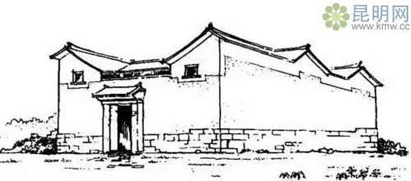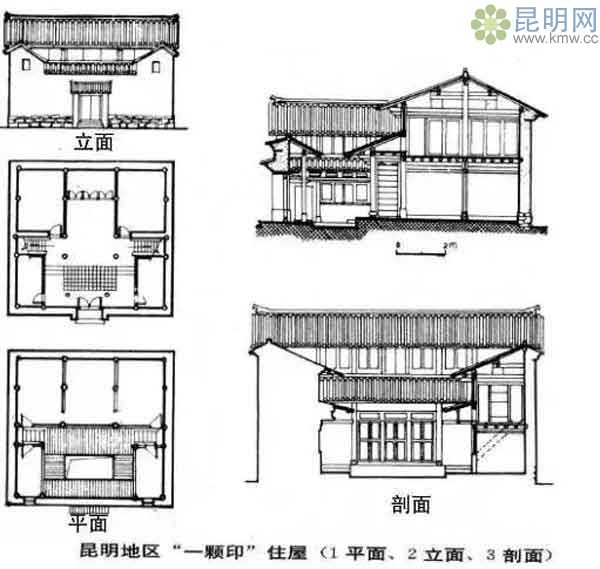 漢族的這種“一顆印”式民居建筑,在時光的長河中,漸漸還影響到了生活在周邊少數(shù)民族的建筑文化,如生活在昆明沙朗等地白族所建的民居建筑。
