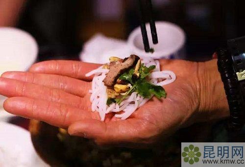 吃過手米線時(shí)需先取一團(tuán)米線置于手心