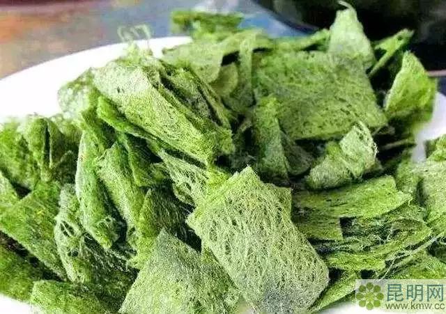 在青苔上撒些姜末、鹽水后曬干,制成青苔片。將青苔片剪成小塊入油鍋,炸至金黃,即可食用。經(jīng)過高溫油炸,青苔的腥味被去除,炸好的青苔,香氣撲鼻,初嘗香酥可口,細(xì)品回甜。