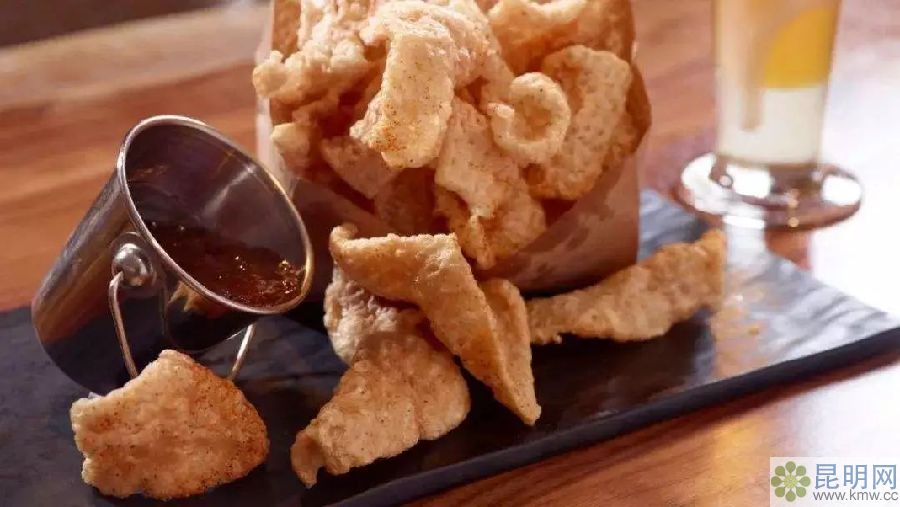 吃油炸豬皮就像是吃薯片一樣酥脆,刮去了肥肉的豬皮吃起來一點(diǎn)都不油膩,外表非常香脆。