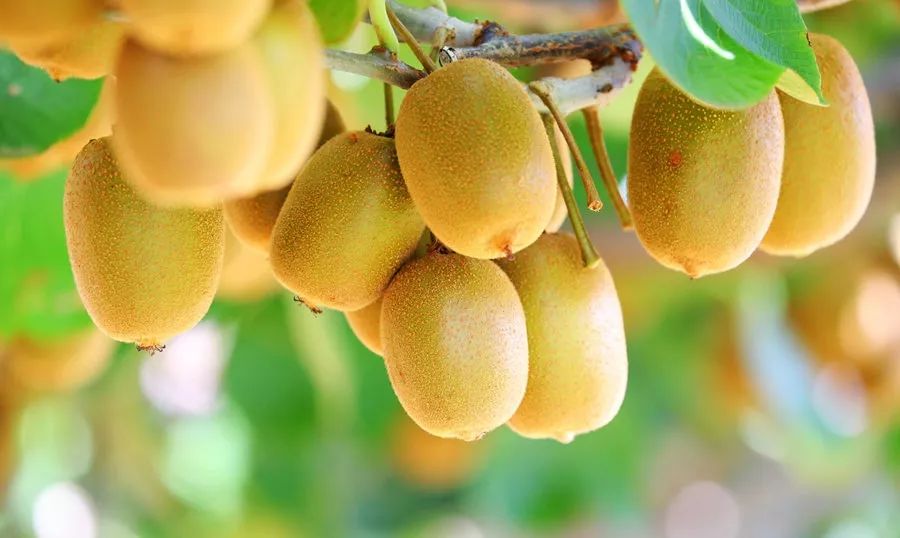橢圓形、黃褐色的獼猴桃掛滿枝頭。