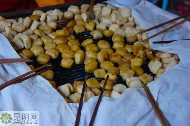 在建水吃燒豆腐最有趣的是:炭火上鐵屜較大,豆腐多堆在一角,食客圍屜而坐,火上熟一個便揀食一個,再將豆腐堆上生的撥入燒上,源源不斷。攤主南向坐,不斷翻動、刷油。屜角備數(shù)個小罐,每一食客有一對應,每吃一個豆腐,攤主就扔一粒包谷在那罐中,待吃完要結(jié)賬,他就傾罐中之包谷粒計數(shù)收款,很有“撒豆成錢”的意味。